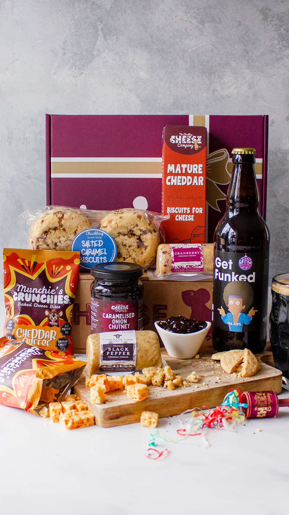 Along with all our cheese hampers & cheese gift box options, we do have an extensive range of alcohol-inspired gifts and sweet gifts.
