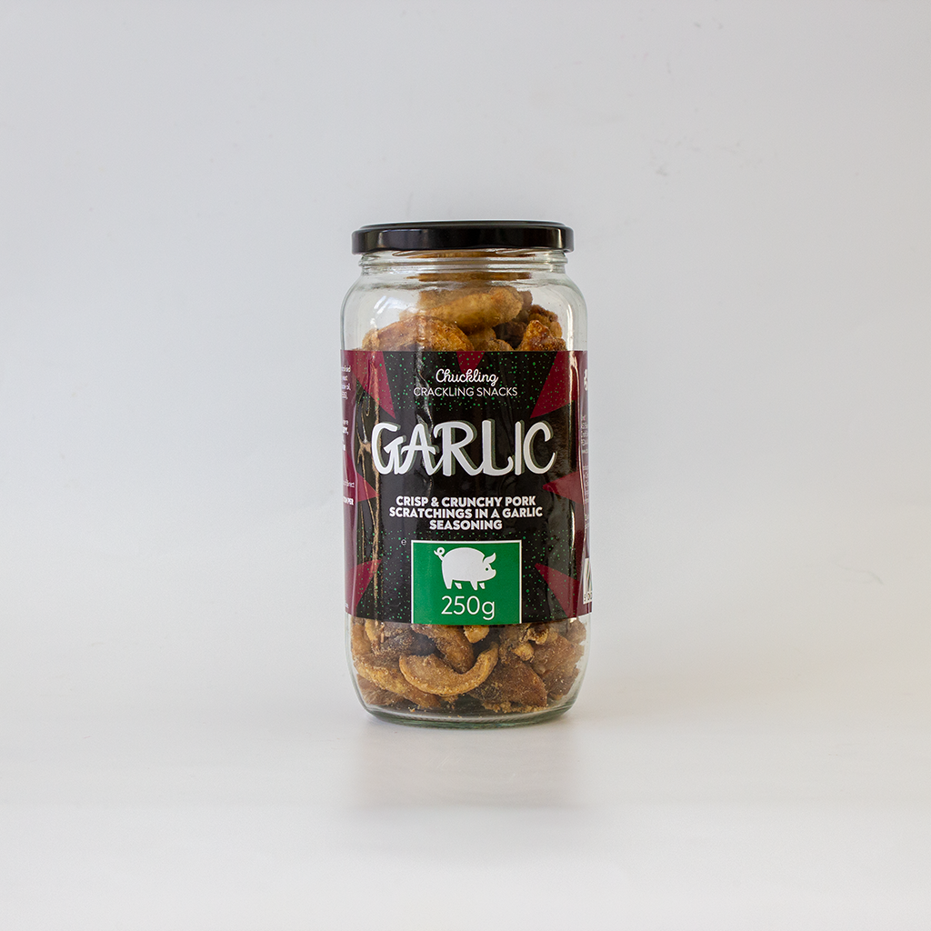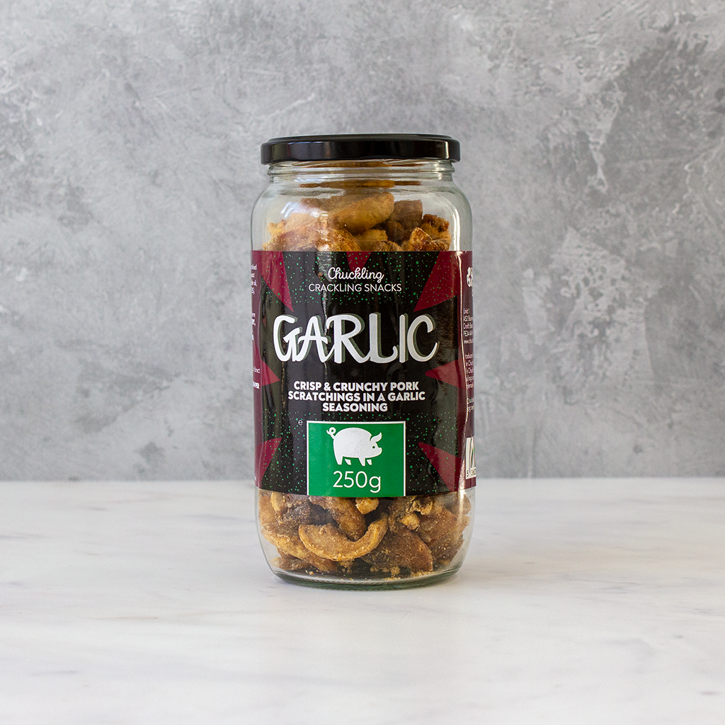 Satisfy your cravings with something savoury and tangy with our Garlic Pork Scratchings Jar. Made with quality pork meat, this jar of pork scratchings is seasoned to perfection with tangy and pungent blend of garlic. Our pork scratchings in a jar are perfect for snacking on while enjoying the game or a quick snack during the day. This pork scratchings gift jar is the ultimate choice for all garlic lovers.