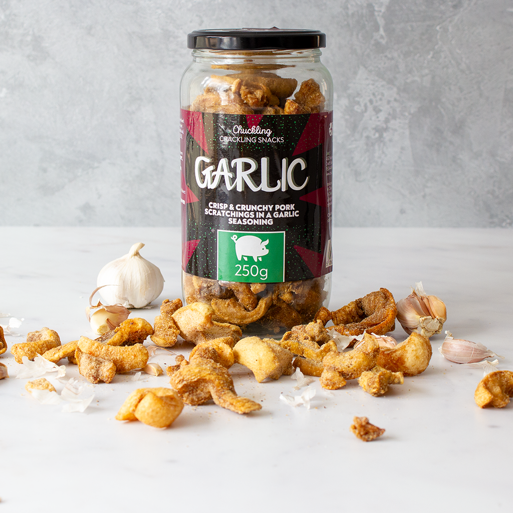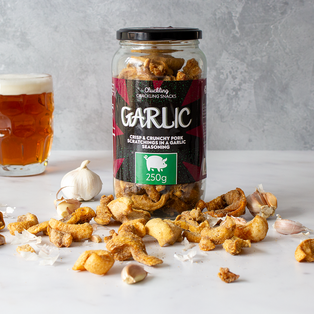 Level up your snacking game with our garlic pork scratchings jar. Made with the finest pork rind and seasoned to perfection with garlic to deliver these pungent, crunchy and flavoursome pork scratchings. Here’s a delicious twist on these classic meat snacks.