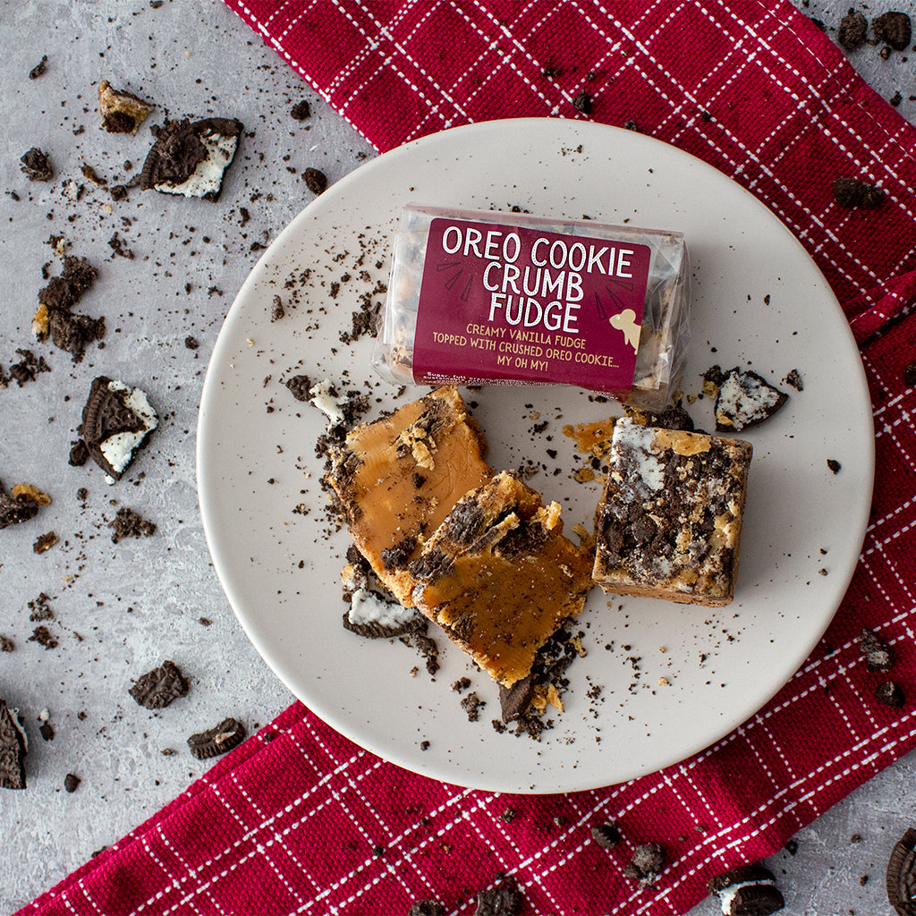 This creamy vanilla fudge is topped with pieces of crushed up cookie. Creamy with a crunchy cookie bite.