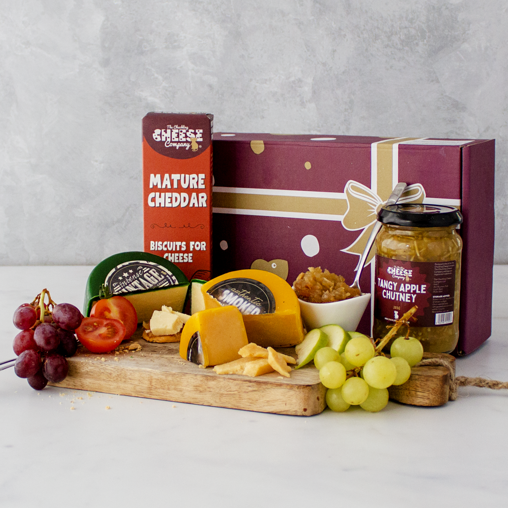 Presenting a fine selection of traditional cheese truckles, accompanied by delicious chutney and savoury biscuits. The included accompaniments pair perfectly with the cheddar to create the ultimate savoury snack of cheese, chutney, and biscuits.
